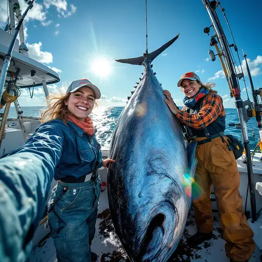 10 months ago A full-length photograph of two female fishermen on a fishing boat with a giant tuna. The giant tuna is huge,The giant tuna is hanging on. Two female fishermen are standing around the giant tuna, and one of them is taking a selfie. Fishing gear is in the background. sun sun shines. yauyau 2 29