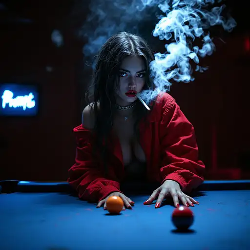 10 months ago Dramatic photo, visual tension, anthropomorphic ,pertty female,wearing red casual wear, holding a pool cue, sitting on a pool table in a pool room, smoking cigarettes and exhaling smoke, hyper detailed, UHD, ultrawide, with a blue neon sign that says PromptHero in the background visible to the left. yauyau 1 47