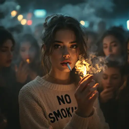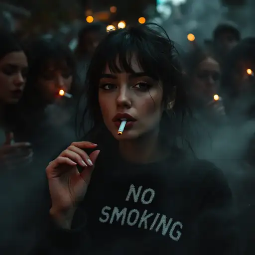 10 months ago photo of a pertty female with cigarette in her mouth,wearing knitted sweater with text "NO SMOKING". surrounded by a group of smoking female,misty dimly lit smokey fog, cinematic atmosphere, attention-grabbing composition, focus on a cigarette. yauyau 2 55