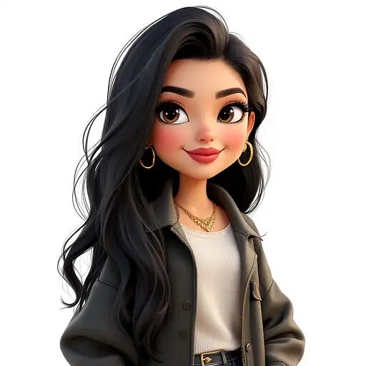 8 months ago create in the style of 3D Disney Pixar like Russian curvy chibi with loving and cheerful exaggerated features and expressions. Long wavy black hair in a trending urban style, with tiny gold earrings and herringbone necklace. Wearing trendy clothes like outfits from head to toe found on fashion nova online store ymiriofosso 0 76