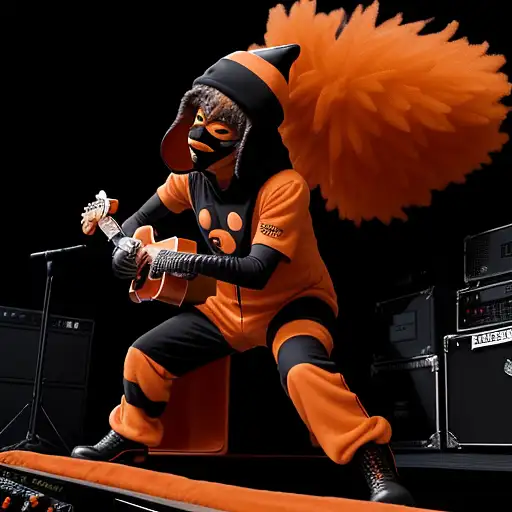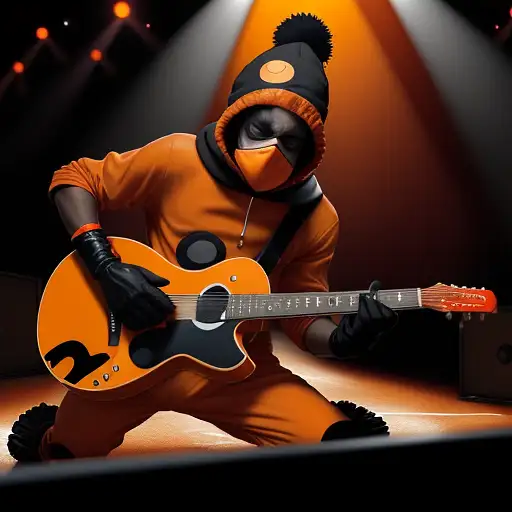 2 years ago we see a black man in a orange wally hat and black domino mask and is wearing a orange onesie, black gloves and black boots, holding a red guitar and playing in a rock concert towards thousands of screaming fans. zoz021 0 53