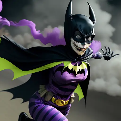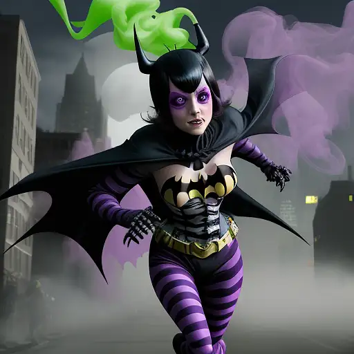 2 years ago beetle juice in batman costume is running with a robin skeleton and a winona ryder is batgirl wearing a pink and purple stitch up costume who is also running with them in green smoke fog zoz021 0 26