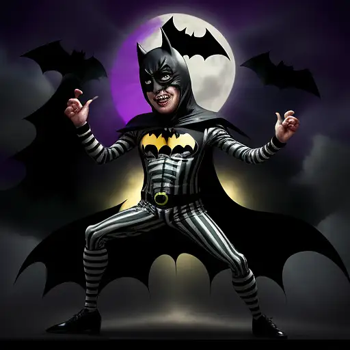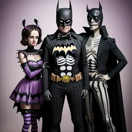 2 years ago beetle juice in batman costume is next to a with a skeleton wearing A robin COSTUME and WITH winona ryder AS batgirl wearing a pink and purple stitch up costume zoz021 0 18