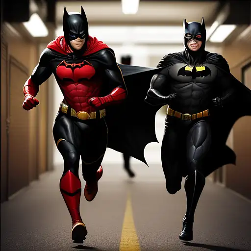 2 years ago We are see two black African British crime fighting superheroes... both in batman type suits. Both running towards camera, the guy on the left, is a black guy wearing a red batman suit, yellow gloves and boots and belt, with sunglasses and a backwards baseball cap hat,with a black cape. The guy on right, is a shorter version, light brown skin but in a purple batman suit... yellow gloves and boots and belt, with sunglasses and a backwards baseball cap hat,with a gold cape. The background scenery is a dark, gothic Art Deco type city scape, with a Burgundy red sky in the moonlight and a spot light single with a ZOZ in it. zoz021 0 71