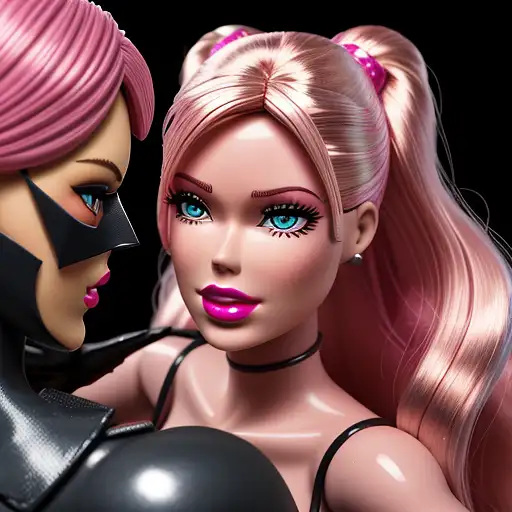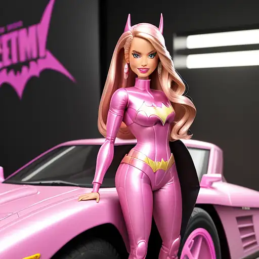 2 years ago A BARBIE IN A PINK METALLIC BATMAN STANDS IN A RUNNING POSE IN A YELLOW AND RED RISING SUN BACKGROUND zoz021 0 52