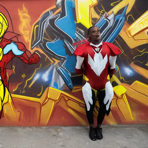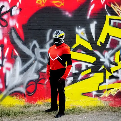over 2 years ago a black man in a red and yellow suit, wearing a red power ranger helmet holding spraycans in front of a graffiti wall with the word zoz standing like a superhero zoz021 0 41