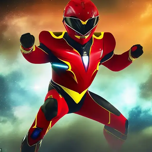 over 2 years ago a blackman in a red and yellow superhero suit in a red power ranger helmet, is holding two sprays in front the midnight sky standing like a superhero zoz021 0 52