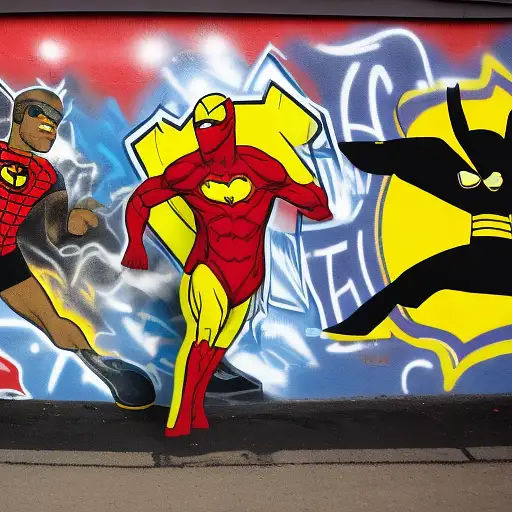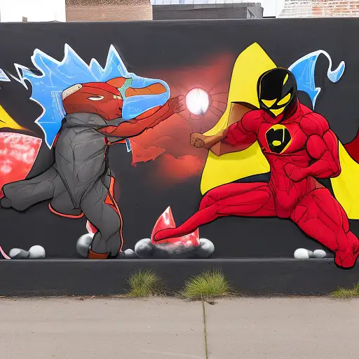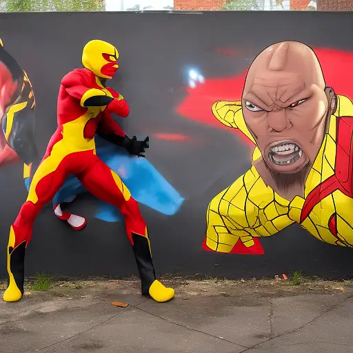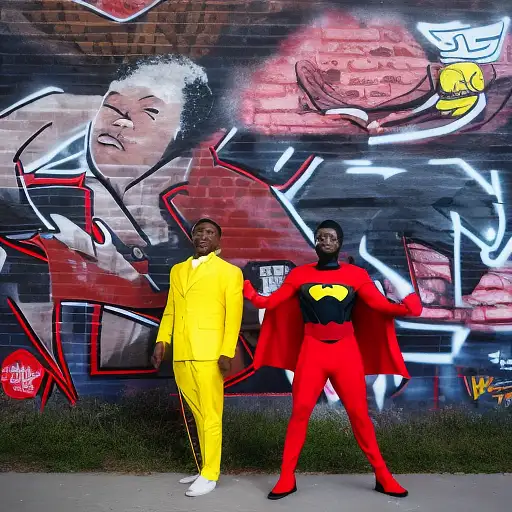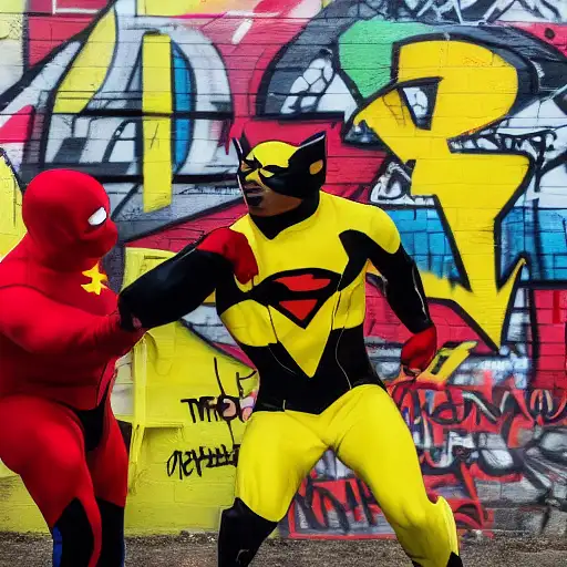over 2 years ago a blackman in a red and yellow superhero suit fighting a white man in a dog superhero suit, in front of a graffiti wall artstation,t symmetrical artwork. cinematic, hyper realism, high detail, octane render, 8k zoz021 0 90