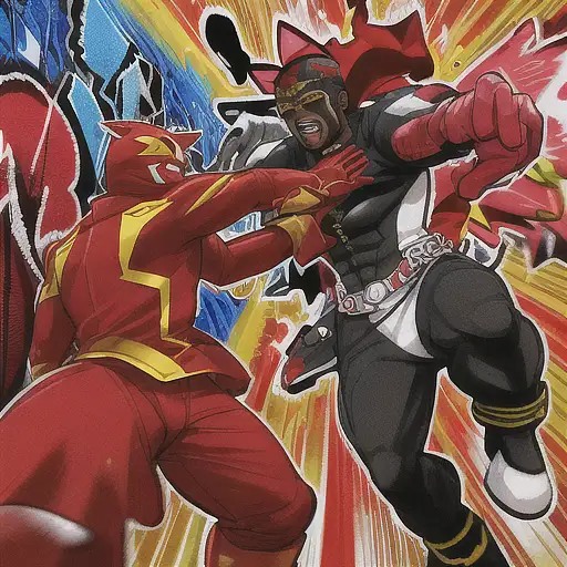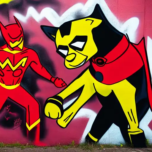 over 2 years ago a blackman in a red and yellow superhero suit fighting a white man in a dog superhero suit, in front of a graffiti wall zoz021 0 50