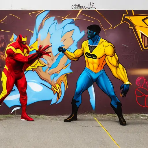 over 2 years ago a blackman in a red and yellow superhero suit fighting a white man in a dog superhero suit, in front of a graffiti wall zoz021 0 51